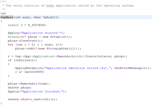 Minden bada alkalmazás belépési pontja az OspMain függvény, mely a parancssori paramétereket előkészíti (bár parancssor jelenleg számunkra nem elérhető), majd átadja a vezérlést az Application Frameworknek. Át kell adni egy factory metódust, amivel majd a keretrendszer az alkalmazásunkat példányosítja, ugyanis teljes hosszában a keretrendszer felügyeli az életciklust. Nekünk semmi dolgunk nincs itt igazából, az ehhez szükséges a kódot az IDE generálja, ha Form vagy Frame alapú alkalmazássablont kértünk.