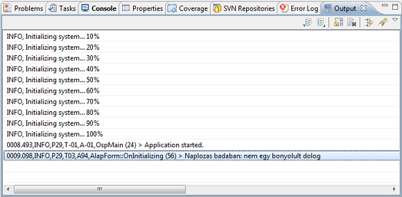 Az üzenetek a fejlesztői környezet Output című ablakában jelennek meg, ezt a Window menü Show View menüpontjában rakhatjuk ki a felületre. Az ablakocska jobb felső sarkában hat gombot találunk, amelyekkel többek között elmenthetjük a bejegyzéseket, korábbi naplófájlt tölthetünk be, kereshetünk és szűrhetünk a sorok között.