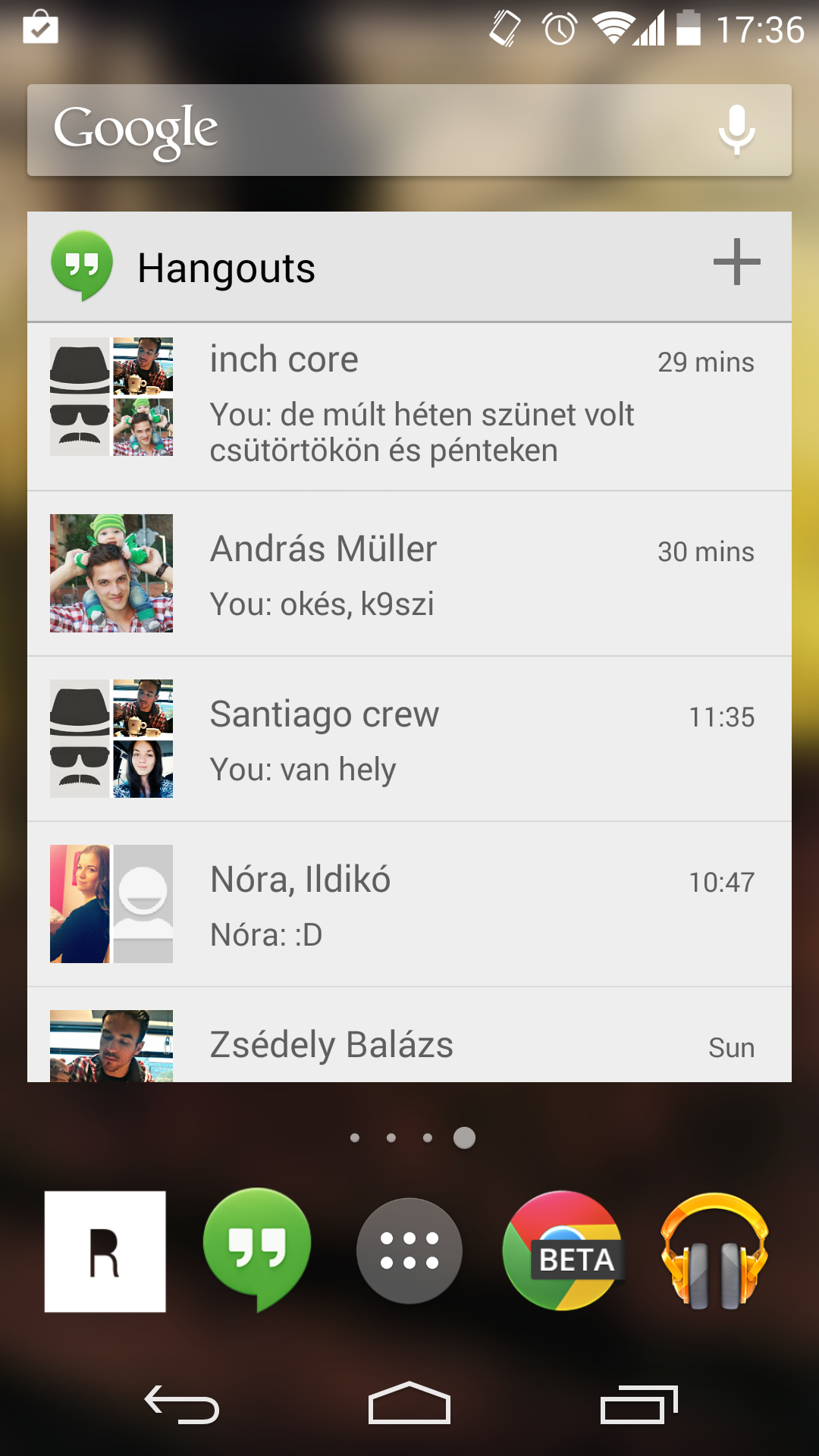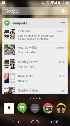 A Google a tavalyi I/O konferencián rántotta le a leplet a Hangouts névre hallgató szoftverről, mely a Google Talk helyett érkezett. Első körben mindössze egy online csevegőkliensről volt szó, mely egy későbbi frissítés után SMS-ek küldésére és fogadására is képessé vált. A KitKat megjelenése óta a gyári üzenetkezelő alkalmazás szerepét is átvette, egységes felületen mutatva a Hangouts-üzeneteket és az SMS-eket.