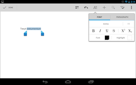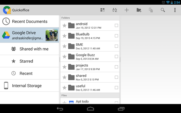 Az elmúlt év fontos hozománya továbbá a Google Drive integráció. Az alkalmazást össze lehet kötni a felhasználó Google-fiókjával, ekkor a készülék belső háttértára mellett a Drive-beli fájlok is megjelennek a dokumentumokat listázó nézetben. Természetesen a Microsoft Office formátumok mellett így a Google Drive saját megoldásait is gond nélkül megeszi a program. A dokumentumokat termsézetesen meg is lehet osztani (ez is Drive-alapon megy), illetve email mellékletként is csatolhatjuk őket. Az említett promóció is ide kapcsolódik: amennyiben bejelentkezünk a Google-fiókkal, 10 GB ajándék kapacitást kapunk a Drive tárhelyhez. Ez egyébként nem jelenik meg azonnal, de nem szabad megijedni, a vállalat blogposztja szerint az elkövetkezendő hetek során osztják ki az extra gigabájtokat. Sietni viszont érdemes, az akció ugyanis szeptember 26-ig, azaz még három napig tart.