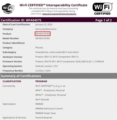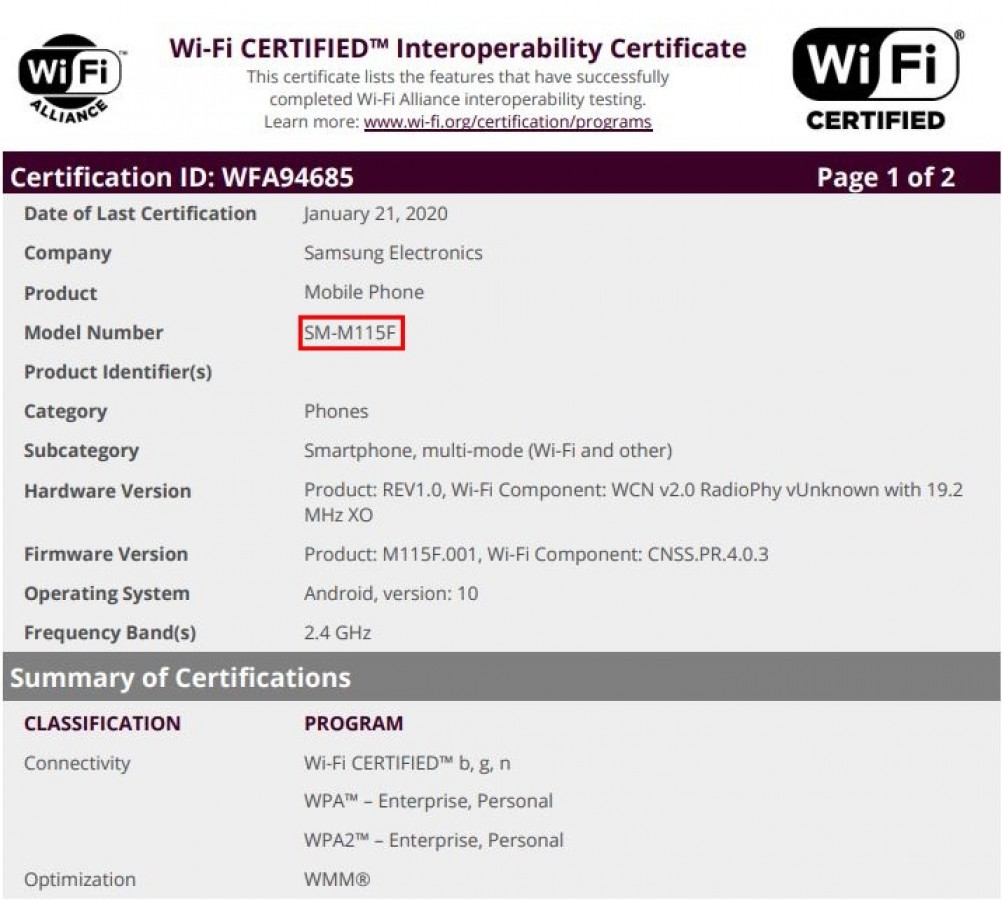 A Wi-Fi certifikációk alapján mindhárom eszköz Android 10-zel fut, de csak az M31 (SM-M315F/DS) kap kétcsatornás Wi-Fit, az M11 (SM-M115F vagy DS) és az A11 (SM-A115F vagy DS) marad egycsatornás, 2,4 GHz-es hálózatokon. A Galaxy M31 korábban már felbukkant Exynos 9611/Snapdragon 665 rendszerchippel és 6 GB RAM-mal, továbbá állítanak hozzá 48 megaixeles főkamerából, 12 megapixeles széleslátóból és 5 megapixeles mélységérzékelőből álló hátlapi triót.