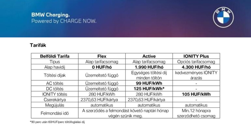 A szolgáltatás másik sarokköve az árazás. Noha egyre több töltési szolgáltató biztosít olyan havidíjas csomagokat, amelyek csökkentik a töltés költségét, ezek természetesen csak az adott cég holdudvarába tartozó töltőkön érvényesek. A BMW Charging ezzel szemben egységárat kínál, függetlenül attól, hogy az adott töltőn aktuálisan mennyibe kerül 1 perc, vagy 1 kWh-nyi töltés, ez pedig egyrészt kiszámítható, másrészt pedig sok esetben kimondottan kedvező, de egyszerűbb, ha egy táblázattal szemléltetjük: