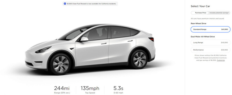 A 25 ezer dolláros Tesla modell érkezéséig Musk arra számít, hogy az Egyesült Államokban tavalytól elérhető Model Y lesz a márka legnépszerűbb villanyautója, amely január elején Kínában is elstartolt, és az Electrek információi szerint az első negyedéves készlet már gazdára is talált. Ott éppúgy a jármű Long Range Dual Motor (52 ezer dollárnak megfelelő jüan) és Performance változata rendelhető meg (56 ezer dollár), ahogy az Egyesült Államokban (50, illetve 60 ezer dollár). A Tesla amerikai konfigurátorában ugyanakkor most megjelent a korábban belengetett Standard Range modell 244 mérföldes EPA hatótávval, 135 mérföld/órás végsebességgel és 5,3 másodperces gyorsulással (0-60 mérföld/óra).