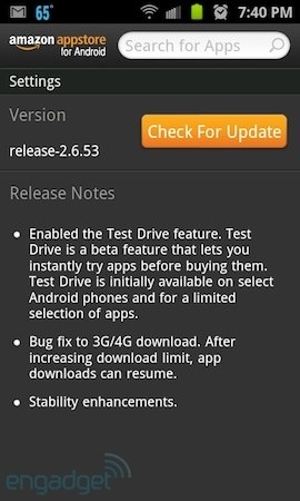 Az Amazon alkalmazásboltjának egyik nagy dobása a „Test Drive” szolgáltatása lehet, mely a prémium alkalmazások tesztelését egy asztali böngészőben futó emulátor segítségével még a vásárlás előtt kipróbálhatóvá teszi. A sikeres kezdeményezés mostantól közvetlenül az Android-alapú készülékekről is elérhetővé vált, mely a próbaváltozat nélküli alkalmazások esetén is hagy némi gondolkodási időt. Elemzők szerint az Amazon kissé komplikált, emulátort igénylő megoldásánál sokkal egyszerűbb, ha maguk a fejlesztők készítenek ingyenes próbaváltozatokat, melyekből a teljes változatok aktiválása néhány kattintással megoldható.