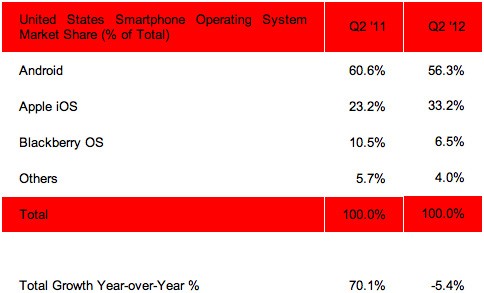 A Strategy Analytics beszámolója szerint az áprilistól júniusig tartó negyedév során az Android platform piaci részesedése az Egyesült Államokban 4,3 százalékkal csökkent, vagyis a globális trendekkel tökéletesen ellentétes képet mutatott. A Google stratégiai partnereinek persze ennek ellenére sincs komoly okuk az aggodalomra, hiszen a visszaesés egy év alatt 60,6-ről 56,3 százalékra történt, vagyis még így is bőven domináns szerepet tölt be. Ami viszont meglepő, hogy a vártnál gyengébb eladásokat produkáló Apple ugyanezen időszak alatt 23,2-ről 33,2 százalékra tudta növelni részesedését, mely részben Android, részben BlackBerry vásárlók elcsábításából született. A Research In Motion hanyatlása viszont egyelőre megállíthatatlannak tűnik, hiszen egyetlen év alatt 10,5-ről 6,5 százalékra zuhant a részesedése, mely tendencia a BlackBerry 10 platform 2013 első negyedéves premierjéig egészen biztosan kitart majd.