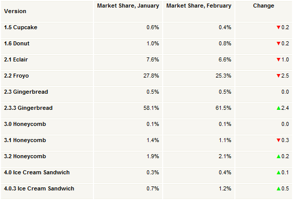 Több mint négy hónap telt el az Android 4.0 Ice Cream Sandwich október 19-ei leleplezése óta, ám a jelentős belső átalakítások miatt a platform korábbi készülékekre történő átültetése továbbra is igen lassan halad. A februári statisztikák szerint az új verzió piaci részesedése nagyjából 1,6 százalék körüli lehet, míg a Gingerbread változat a szegmens 62 százalékát uralja. A kizárólag táblagépekre szánt Android 3.0 Honeycomb részaránya – a rendszerfrissítéseknek köszönhetően – némiképp visszaesett. A keresőóriás reményei szerint a telefonok és internettáblák közötti egységet teremtő ICS platform térnyerése jelentősen felgyorsulhat a következő néhány hónapban.