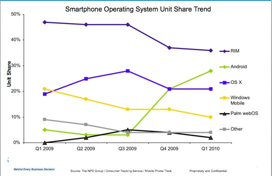 Ha lassan is, de úgy tűnik, hogy kezd beindulni a Google szekere, hiszen számos partnerének köszönhetően egyre nagyobb térhez jut az Android operációs rendszer. A Boy Genius Report értesülései szerint a januártól márciusig tartó negyedév során az Egyesült Államokban már a második legnépszerűbb okostelefon platform lett az Android, méghozzá 28 százalékos piaci részesedésével, és ha a trend tovább folytatódik, akkor hamarosan maga mögé utasíthatja az immáron mindössze 36 százalékos részesedéssel rendelkező RIM BlackBerry operációs rendszert is. Az Apple iPhone OS mindössze 21 százalékos részesedése elsősorban annak köszönhető, hogy tavaly július óta nem jelent meg új készülék, és nyilván sok potenciális vásárló inkább megvárja az év második felében piacra kerülő 4G/HD kiadást. Európa és Ázsia jelentős részén a kép egészen másképp fest, hiszen ezen régiókban a Symbian modellek iránti kereslet a legerősebb.