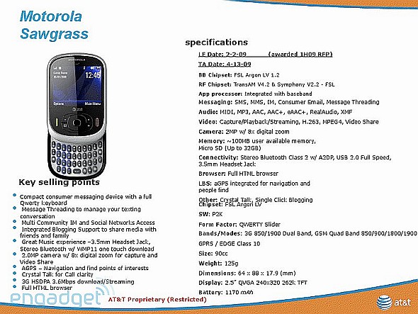 Previously there have been many rumors about Motorola's Android handset, the most exciting of these probably being "Calgary" with its sideway sliding QWERTY keyboard. AT&T is expected to launch a similar Motorola slider in early November, but this time the keyboard slides vertically. Motorola "Heron" features a 2.8" display, a 3.2 megapixel camera, a GPS module and 3G support. The bit poor specs won't make the phone a competitive offer by the end of the year, even in spite of the Android OS, as by then besides LG, Samsung and HTC, Sony Ericsson will have also launched Android phones. The handset codenamed "Sawgrass" has also been uncovered by internal AT& information, this one has been known earlier as "Alexander".