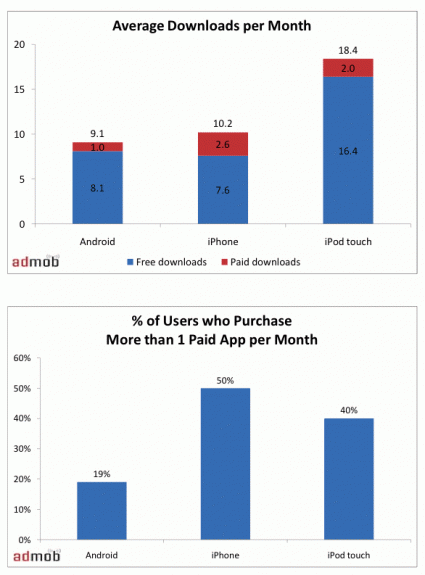 A piackutató elemzése szerint az Apple online alkalmazásboltját felkereső 26,4 millió iPhone és 18,6 millió iPod Touch felhasználói tábora eltérő letöltési szokással rendelkezik. Míg az iPhone tulajdonosok átlagosan havi 10,2 alkalmazást töltenek le, melyből 2,6 a pénzért megvásárolt tartalom, addig az iPod Touch felhasználói 18,4 alkalmazással bővítik készülékük havonta, ám ebből mindössze 2 fizetős tartalom. A gyakorlatban ez azt jelenti, hogy az iPhone felhasználók fele, illetve az iPod Touch felhasználók 40 százaléka vásárol havonta legalább egy új alkalmazást.