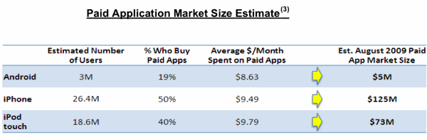 A Google által üzemeltetett Android Marketplace egyelőre nem tud ilyen fényes sikerről beszámolni, hiszen a 3 milliós Android felhasználó havonta átlagosan ugyan 9,1 alkalmazást tölt le, ebből azonban csak egyért adnak ki pénzt. Más szemszögből nézve ez azt jelenti, hogy az Android modellek felhasználóinak mindössze 19 százaléka vásárol havi szinten legalább egy új alkalmazást, mely révén a Google online piacterének forgalma éves szinten körülbelül 60 millió dollár körül alakulhat. A tizenötször kisebb Android felhasználói tábor tehát negyvenszer kisebb pénzforgalmat jelent a gyakorlatban.