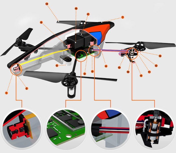 - Magnetométer: A repülő ennek segítségével érzékeli az okostelefon/táblagép helyzetét és azt használja fel referenciapontnak, ami a 2.0-s AR.Drone egyik újításánál, az Absolute Control nevű irányításnál játszik szerepet.