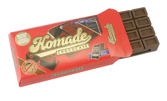 Kevésbé röhejes, inkább jópofa ötlet a svájci csokira hajazó tok, piros csomagban, vicceskedő feliratokkal (100% non-cocoa), és olyan halmazállapottal, mint egy halott ember karja. Beletéve az iPhone 4-et persze szépen rásimul a barna burkolat, ami mindenképpen elég megdöbbentően tud kinézni egy tárgyalóasztalon.