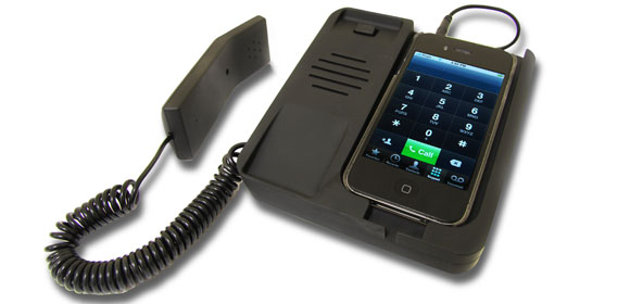 Utolsó delikvensünk a Desktop Phone nevet viseli, ez igen nagy, viszont nagyon mókás. Egy azstali, vezetékes telefont imitál, puha műanyag borítja, van egy klasszikus kézibeszélő rajta, alul kihajtható lábakkal tudjuk megdönteni az egészen, egy pici kábellel pedig az iPhone 4 jack csatlakozójához dughatjuk a motyót. A szerkezeten egyébként hagytak helyet a dock connector számára is. Az üzemkész összeállítás úgy működik, hogy a csörgő telefont a kézibeszélő megemelésével tudjuk felvenni, ezen csacsoghatunk. Ha nem vesszük fel,akkor a kézibeszélő hátulján levő gombot megnyomva aktiválhatjuk a kihangosítást. A gyártó szerint azok számára is hasznos a cucc, akik félnek a fejhez tett mobil által kibocsátott sugárzástól.