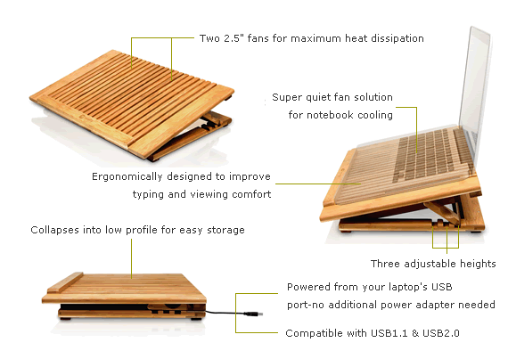 Hogy mi ez a cucc? Egy bambuszból készült, nagyon környezettudatos (és ebből adódóan nagyon menő) notebooktartó "állvány", melyben található két darab, percenként 2300-as fordulatszámon pörgő ventillátor. Ezek egy USB-kábelről veszik fel az áramot, azaz a kiegészítő használata elfoglal egyet az igen értékes csatlakozókból, de ezt máshogy nyilván nem lehet megoldani. Hangsúlyozandó, hogy bár az Apple kiegészítőkre szakosodott Macally gyártja a cuccot, nem feltétlenül MacBookokhoz való, bár azok között is akad egy-két melegedésre hajlamos modell. Más gyártóknál viszont néha becsúsznak olyan notebookok, melyek komoly munka esetén sajnos tényleg igénylik az aktív hűtést, amennyiben nem asztalon használjuk őket annak; annak hiányában ugyanis felmelegíthetik a lábunkat. Na, ezekhez a gépekhez használható egy efféle kiegészítő.
