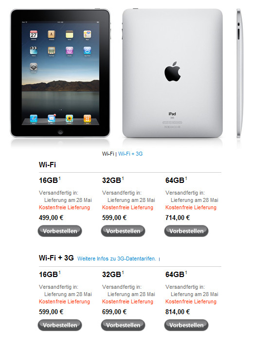 Az Apple hivatalosan is bejelentette első internettáblájának nemzetközi árazását, mely azonnal előrendelhetővé is vált Kanadában, Japánban, Ausztráliában, az Egyesült Királyságban, Franciaországban, Németországban, Olaszországban, Spanyolországban és Svájcban. Az iPad WiFi, illetve WiFi + 3G változata Európában május 28-tól lesz kapható, méghozzá mindenütt közel azonos áron. Az iPad 16GB ára 479 és 499 euró között mozog, a 32 GB belső memóriával szerelt variáns ára 479 és 499 euró között alakul, míg az iPad 64GB ára 679 és 714 euró között változik. A legolcsóbban Spanyolországban, a legdrágábban Németországban lesz elérhető az Apple internettábla, mely elsősorban az eltérő általános forgalmi adóval magyarázható. A HSDPA modemmel szerelt iPad WiFi + 3G modellekért minden régióban 100 eurós felárat kell fizetni.