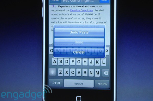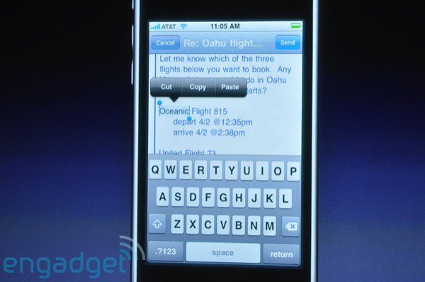 Az Apple tegnap mutatta be az iPhone és iPod Touch készülékéhez szánt legújabb firmware új szolgáltatásait, melyek között ezernél is több új fejlesztői interfész és száznál is több új funkció szerepelt. A legfontosabb új szolgáltatások a teljes vágólap funkció, A2DP, azaz sztereó Bluetooth (mely nem érhető majd el iPhone 2G modellre), mindenütt használható vízszintes üzemmód, globális keresési funkció a telefonon tárolt tartalmak között, hivatalos MMS támogatás (mely 2G modellen nem üzemel), e-mailek egyedi törlése és továbbítása, automatikus WLAN hotspot keresés, Bluetooth fájlcsere és távvezérlés, jelszókezelő és YouTube támogatással bővítés Safari böngészőhöz, több kép egyszerre történő csatolásának lehetősége, naptár és Exchange támogatás, híváselőzmények, közvetlen iTunes regisztráció, élő videó és hang streaming, hangfelvevő és rázással vezérelhető lejátszó funkciók. A teljesen integrált vágólap használatához kettőt kell kattintani a kijelölni kívánt szövegrészen, ahol ekkor megjelenik egy jelölődoboz, melynek sarkaival pontosan be lehet állítani a másolni kívánt tartományt, melyet ezután ismételt dupla kattintással lehet a vágólapra helyezni. A tartalomkeresés közvetlenül a készenléti kijelzőről lesz elérhető, melyhez egyszerűen csak balról jobbra végig kell húzni az ujjat a kijelzőn. Nagy változáson esik át az App Store alkalmazásboltok támogatása is, ugyanis ezentúl közvetlenül a programokból lehet majd frissítéseket, új pályákat vagy egyéb kiegészítőket vásárolni.