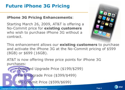 According to a part of the internal AT&T training material, published by Boy Genius Report, existing clients of the American operator can get an iPhone 3G without a fidelty contract and they don't have to change their subscription plan either. The decisin means that AT&T clients will have the chance to get Apple's phone when lenghtening their contract, or even when they don't do that, thus the phone will be like any other standard handset. The no-commit price of iPhone 3G 8GB will be 599 USD, while the 16GB edition will cost 699$.