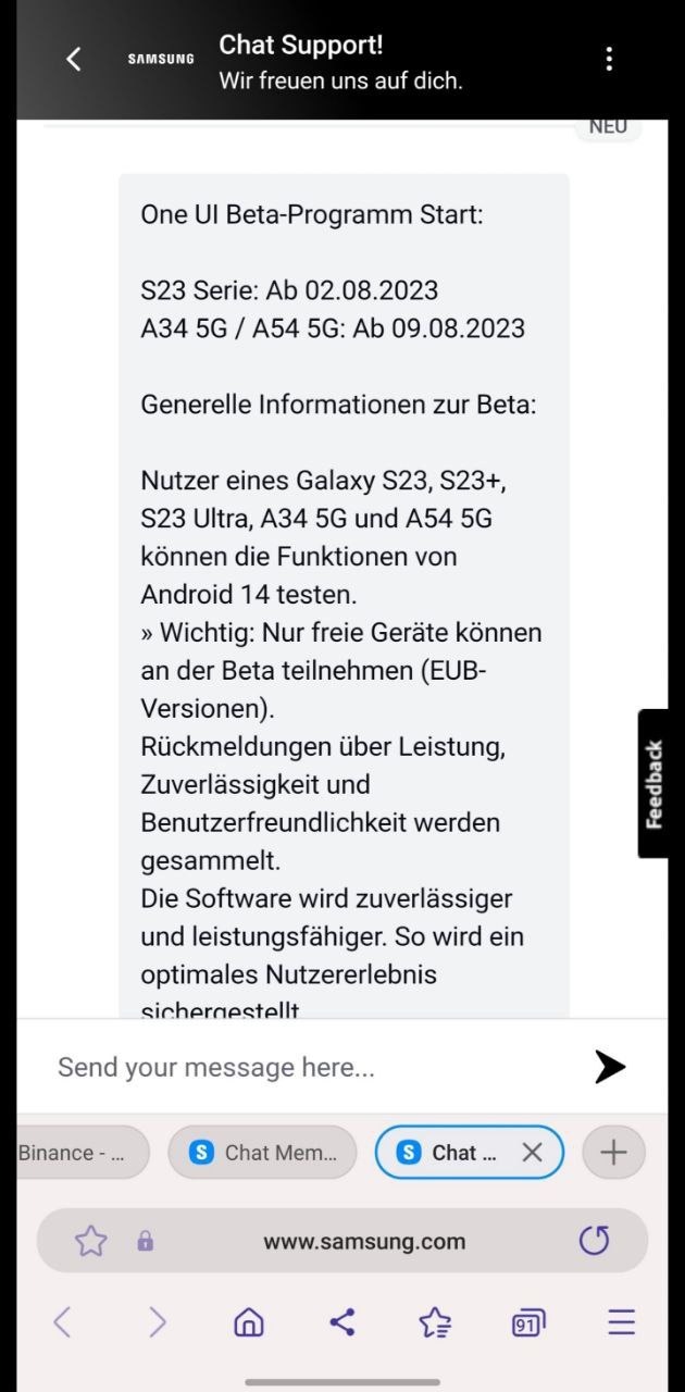 Egy ideig úgy tűnt: július végén, a tegnapi Galaxy Unpack esemény után mindjárt indul az Android 14-en alapuló One UI 6.0 béta program, egy német nyelvű chat válasz a Samsung ügyfélszolgálatától viszont elég egyértelműen arra céloz, hogy pár napot még türelemmel ki kell bírni. Eszerint a Galaxy S23 családon augusztus 2-án indul a publikus béta tesztelés, ami persze limitált számú felhasználót fogad, néhány régióra korlátozva.