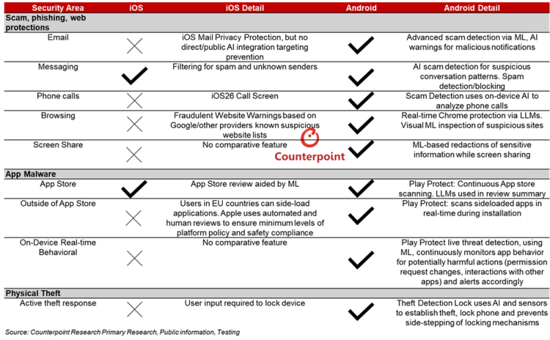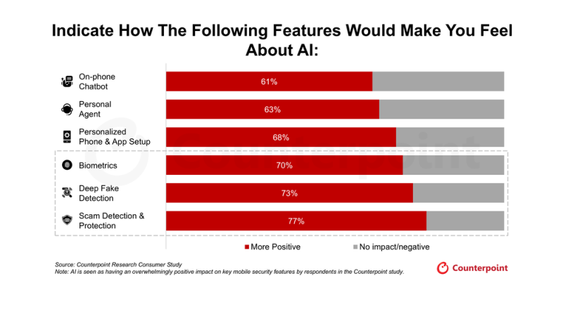 Három szempontnak volt a legpozitívabb az értékelése: különösen fontosnak találták az AI szerepét az átverések elleni védelemben (77%), a deep fake tartalmak felismerésében (73%) és a biometrikus védelem erősítésében (70%). Szintén pozitív volt a hozzáállásuk az AI szerepéhez a telefonok személyre szabásában (68%), az AI ügynökök használatában (Siri, Gemini stb., 63%) és a telefonon elérhető chatbotok használatában (61%), bár ez utóbbi bírt a legkisebb fontossággal. A felhasználóknak a Counterpoint szerint a vásárláskor egyre fontosabb szempont az AI által erősített biztonság színvonala, és ebben a tekintetben vetették össze az Android és az iOS jelenlegi, mesterséges intelligencia által támogatott szűrőit és védőgátjait.