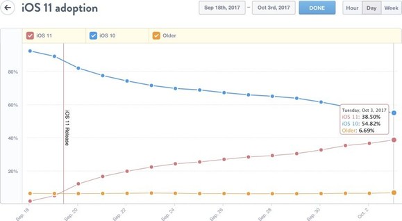 Az Apple éves fejlesztői konferenciáján júliusban bemutatott iOS 11 szeptember végén érkezett meg a kompatibilis készülékekre. Az első 24 órában az eszközök 10%-át frissítették a felhasználók, egy hét alatt pedig ez a szám is több, mint duplájára nőtt. A kiadást követő második hét végén, tehát most, az iOS 11 penetrációja 38,5%-os, a készülékek közel harmada már a legfrissebb rendszerrel fut. Ahhoz képest, hogy a tavaly óta aktuális az Android Nougat még a mobilok 17,8%-án érhető el, az Oreo pedig több mint egy hónap alatt volt képes statisztikailag kimutatható mértéket elérni (0,2), viszonylag lassú az iOS 11-re való átállás.