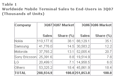 A Gartner piackutató statisztikái alapján 2007 júliusa és szeptembere között összesen 288.934.900 mobiltelefon talált gazdára, mely az előző év azonos időszakához képest 15%-os emelkedést jelent. Az összes értékesített modell 38,1%-a azaz 11.177.800 készülék a Nokia műhelyéből származik, mely nem csak minden idők legnagyobb piaci részesedését jelenti, de az átszervezett működésének köszönhetően közel kétszeres profitot is termelt a finn gyártónak, annak ellenére hogy az egy telefonra vetített vételár 90 euróról 82 euróra csökkent. A csökkenés elsősorban a rendkívül olcsó készülékek piacán való előretörésnek tudható be.