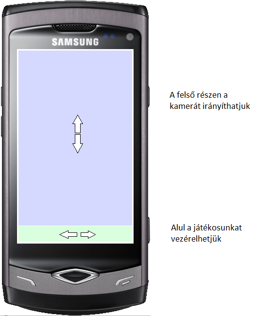 A csúszkánkat természetesen az ujjunkkal vezérelhetjük, ugyanígy irányíthatjuk a kamerát is, viszont előbbit a kijelző aljának, utóbbit a felső részének tapperolásával tehetjük meg (lásd ábra). Az ellenfél csúszkáját pedig az AI fogja vezérelni (hahaha). Tervezem még a multiplayert is, bluetooth segítségével, ez azonban elég ingoványos terület számomra. A kész alkalmazást feltöltöm majd a Samsung Apps Store-ba, hogy bárki kipróbálhassa, ehhez azonban szükségem van egy névre. A jelenlegi “Pong” jogi akadályokba ütközik, arról nem is beszélve, hogy egyáltalán nem eredeti. Ha bárkinek eszébe jut valami, ne tartsa magában!
