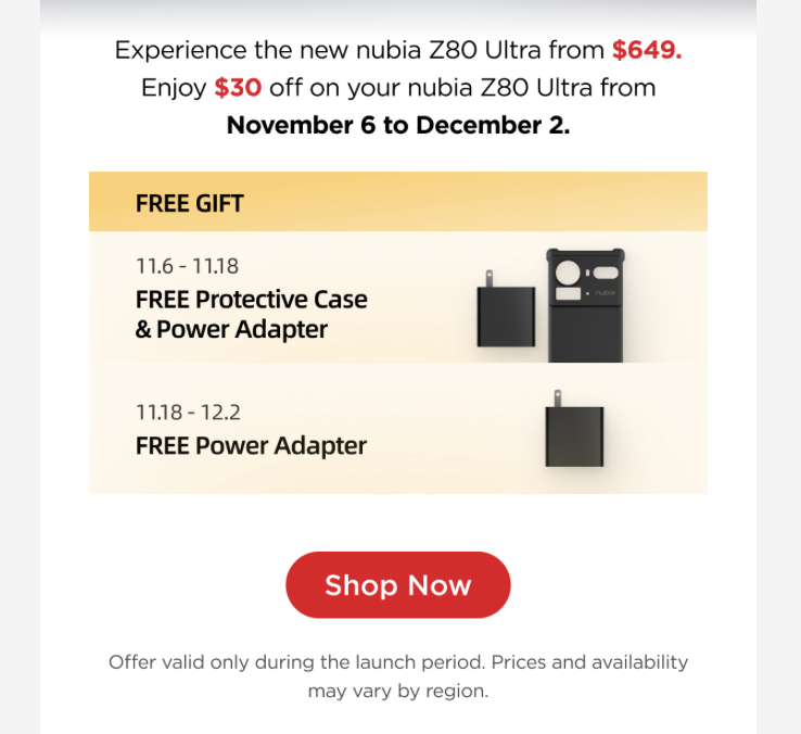 A Nubia EU webáruházában 12/256 GB-os kiszerelésben indul, ennek az ára 649 euró. Van viszont egy 20 eurós kupon a Z80USAVE30 kóddal, ami november 6-tól december 2-ig érvényes. Kapnak gyorstöltőt és ajándék védőtokot is azok, akik november 18-ig rendelnek, de ha valaki erről lecsúszik, december 2-ig az ajándék gyorstöltő így is jár a telefon mellé.