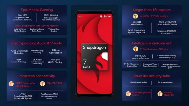 Az 5G adatkapcsolatot a Snapdragon X62 modem biztosítja, ami akár 4,4 Gbps letöltési sebességet is jelenthet; adott a WiFi 6 és az 5.3-as Bluetooth Snapdragon Sound és aptX támogatással. A képernyő maximális képfrissítése 144 Hz lehet, opció a HDR10 és HDR10+ támogatás, a Spectra Triple 14-bit ISP pedig 200 MP képekkel és 4K HDR videófelvételekkel is megbírkózik. A digitális (slussz)kulcsokra és virtuális tárcákra az Android Ready SE és Trusted Management Engine vigyáz. Az első Snapdragon 7 Gen 1 szettel szerelt modellek heteken belül várhatók.