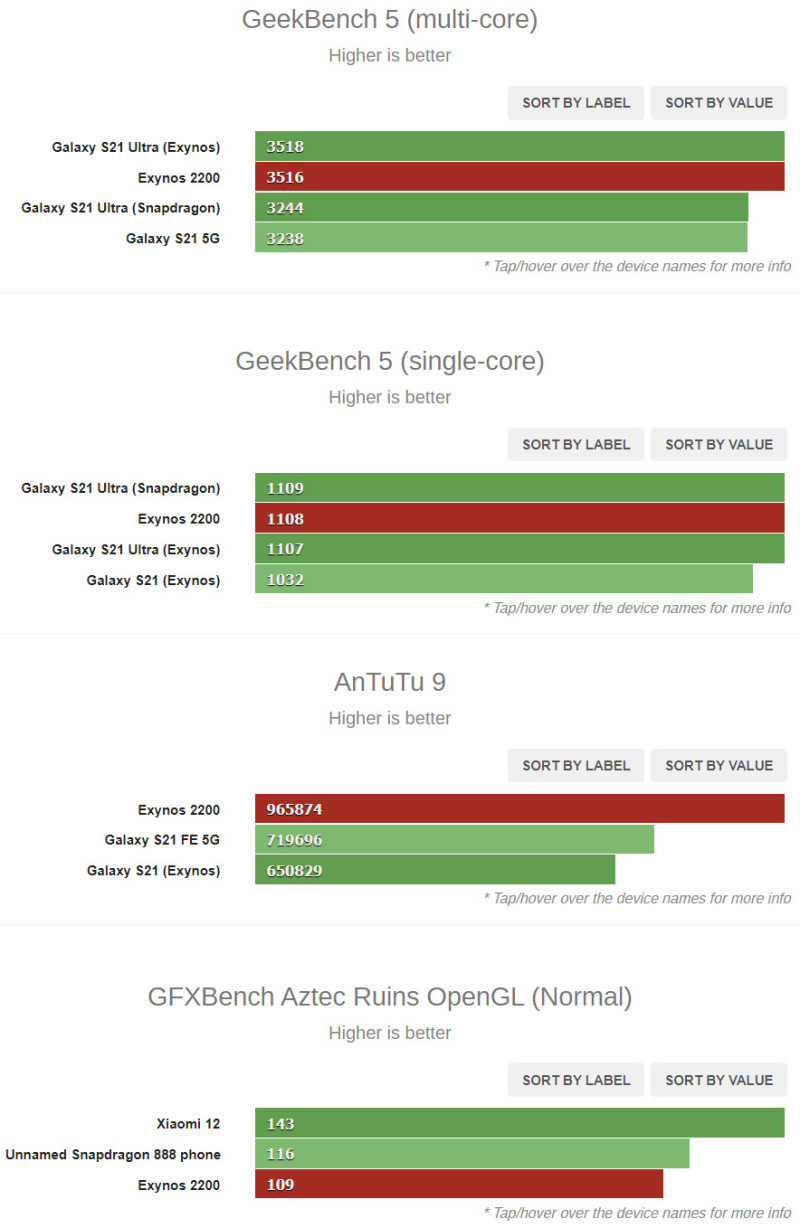 A Samsung végre leleplezte az AMD-vel karöltve megalkotott, 4 nm-es node-on készülő Exynos 2200-at, és habár a teljes hardverspecifikáció még nem publikus, felbukkant bár teljesítményadat, amit a GSM Arena foglalt táblázatba. Fontos megjegyezni, hogy bár elvileg a számokat a közelgő Galaxy S22 Ultra produkálta, a kiadás előtt bőven szokott zajlani a kötelező belső tesztelgetés, nem feltétlenül az abszolút teljesítményre fókuszálva, úgyhogy a megjelenésig a pontok akár drasztikusan is javulhatnak.