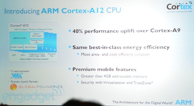 Az új processzorcsalád bemutatását az ARM egy kisebb történeti áttekintéssel kezdte, mely során arra is rávilágított, hogy 2010-ben több mint 300 millió darab, 400 dollárnál is drágább mobil eszköz talált gazdára, ám a következő két év során a drága modellek részaránya 25 százalék alá mérséklődik. Ez persze még így is további bővülést jelent, hiszen elemzői várakozások szerint 2015-ben kétmilliárd okostelefon és táblagép találhat gazdára. A brit chipgyártó éppen ezért a középmezőnyben is tovább akar erősíteni, melynek egyik fontos eleme a 28 nanométeres gyártástechnológiához szánt Cortex-A12 architektúra lesz. A Cortex-A9-nél 40 százalékkal fürgébb magok jóval alacsonyabb fogyasztásúak lesznek, ám big.LITTLE konfigurációban a Cortex-A7 társmagokkal a rendszer fogyasztása még tovább csökkenthető. Az új architektúra mellé az ARM a Mali-T622 grafikus gyorsító és Mali-V500 videomotorok használatát javasolja, melyek sebesség és fogyasztás terén is előrelépést jelentenek. A Cortex-A12 magok piaci premierje a jövő év közepén várható, mellyel együtt az A9 sorozat nyugdíjazása is kezdetét veszi.