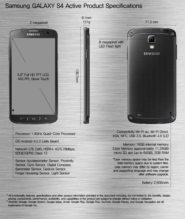 A számos kiszivárgott hírmorzsa után a Samsung ma végül hivatalosan is bemutatta az idei Galaxy S csúcsmodelljének IP67 víz- és porállósági tanúsítvánnyal ellátott változatát, mely elsőként az Egyesült Államokban kerül forgalomba. A Galaxy S4 Active a megjelenítő és kamera terén jelentősen eltér az eredeti változattól, hiszen Super AMOLED helyett 5 hüvelykes Full HD folyadékkristályos panelt kapott, valamint 13 helyett is csak 8 megapixeles fotók rögzítésére alkalmas, ám ehhez vízalatti üzemmód is rendelkezésre áll. A minden dimenziójában nagyobb méretű és 21 grammal nehezebb készülék más paraméterei nem változtak, vagyis 4G LTE és HSPA+ hálózati támogatással, GPS, WLAN, Bluetooth 4.0 és NFC modullal, infravörös távvezérlővel, 1,9 GHz-es négymagos Snapdragon 600 processzorral, 2 GB operatív memóriával, 16 GB belső tárhellyel és 2600 mAh kapacitású akkumulátorral a fedélzetén érkezik. A 139,7 x 71,3 x 9,1 milliméteres és 151 grammos Samsung I9295 Galaxy S4 Active szürke, kék és narancs árnyalatokban kerül forgalomba.