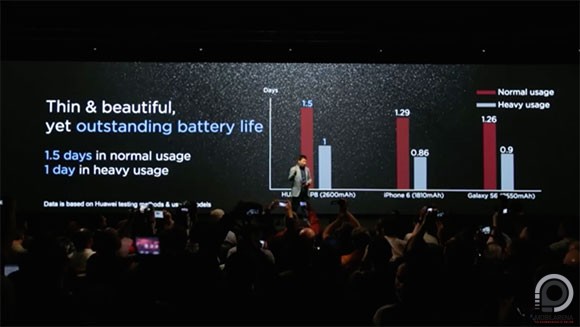 Kevésbé elegáns módon a cég többször is elővette az aktuális iPhone-okat, többek között ezeken keresztül demonstrálták egyrészt az újdonságuk méretét (az 5,2 hüvelykes kijelzővel szerelt P8 a képeken alig tűnik nagyobbnak a 4,7 hüvelykes iPhone 6-nál), másrészt azt, hogy a konkurens Apple és Samsung csúcs-okostelefonokkal ellentétben a hátlap itt teljesen sík, nem emelkedik ki belőle a kamera. A P8 négy színben lesz elérhető, pezsgő, arany, szürke és fekete árnyalatokban kerülhet majd a boltok polcaira.