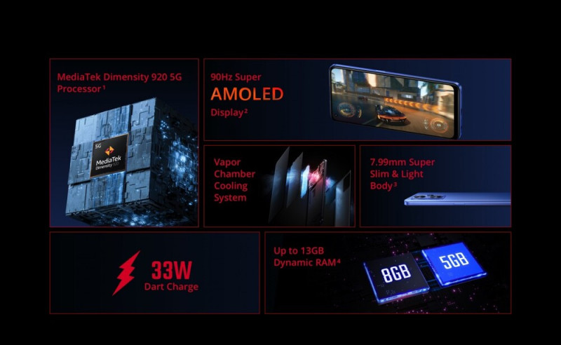 A Dimensity 920 5G szetthez 6 vagy 8 GB RAM választható 128 GB UFS 2.2-es szabványú, nem bővíthető belső tárhellyel. Képeket a 48 megapixeles főkamerával és a 8 megapixeles ultraszéles látószögűvel készíthetünk, a makrókhoz pedig 2 megapixeles szenzor áll rendelkezésre. Örömteli, hogy a kiváló Bluetooth kodektámogatás (SBC, AAC, aptX, aptX HD, LDAC, aptX_TWS+ és LHD)C mellett is megmaradt a 3,5 milliméteres jack, van NFC, WiFi 6, sztereó hangszórók, 5000 mAh-s telep és 33 wattos gyorstöltés.