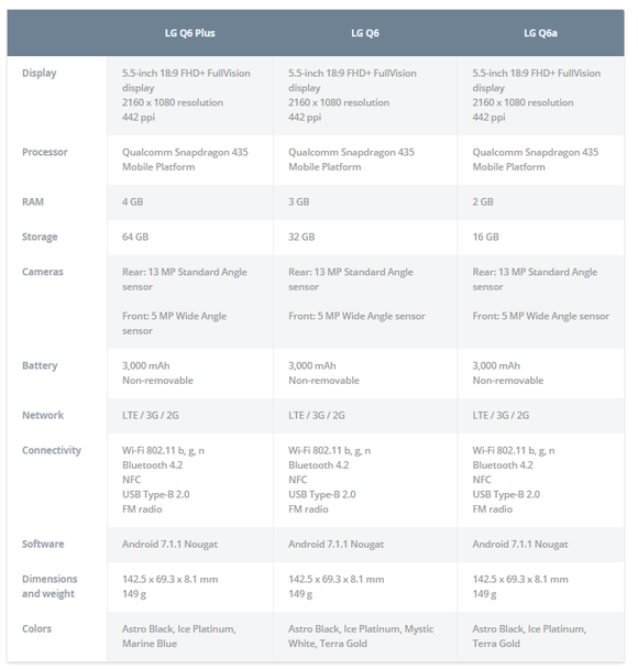 Az LG Q6, az LG Q6+ és a az LG Q6α (Q6alpha) lényegében ugyanaz a készülék, leszámítva a memória méretét. Viszont közös tulajdonság a G6-tal megegyező fémházba épített, 5,5 hüvelykes Full Vision Display. A Full HD+ felbontású, 18:9-es képarányú panel ugyanazt a formanyelvet képviseli, mint a prémium modell.