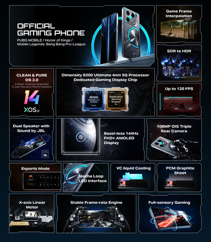 A dizájn a metált és a sebességet akarja megidézni, a hátlapon személyre szabható RGB LED-ek vannak, ezek pedig pár játék esetén egyedi mintában villognak. Az Android 14-es rendszerben van lehetőség arra is, hogy egyedi értesítésekre vagy zenelejátszásra reagáljanak a hátlapi LED fények. A telefonon az XOS 14 felhasználói felület fut, az Infinix pedig két Android-frissítést és három évnyi biztonsági patchet ígér a készülékre.
