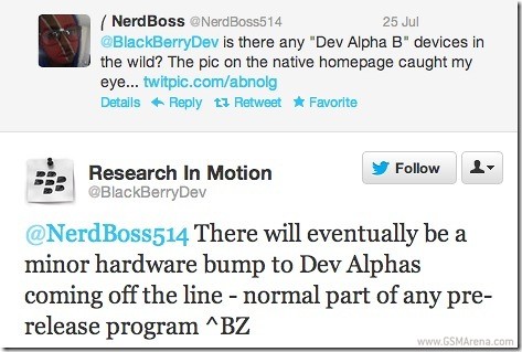 A Research In Motion hivatalos fejlesztői oldalán bukkant fel rövid időre a BlackBerry 10 alapokon nyugvó Dev Alpha B referenciamobil, mely közelgő érkezését ezt követően a hivatalos Twitter oldalán a kanadai gyártó is megerősítette. A nem feltétlenül véletlennek tűnő megszellőztetés egyik célja a szeptember 25-e és 27-e között megrendezésre kerülő fejlesztői konferenciára való emlékeztetés lehet, mely helyszíne a kaliforniai San José lesz. A frissített fejlesztői prototípus pontos paramétereiről nincs információ, de a jelenlegi Dev Alpha 4,2 hüvelykes, 768x1280 képpontos kijelzőt, kétmagos ARM Cortex-A9 processzort, 1 GB RAM-ot és 16 GB belső tárhelyet kapott.
