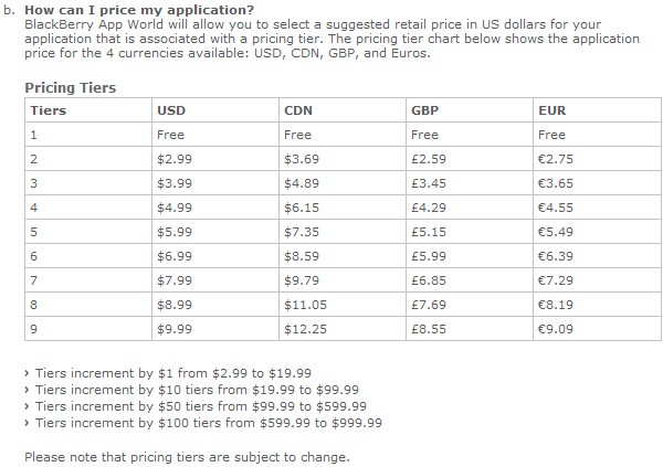 Grown enthusiastic by the success of iPhone and App Store, most large manufacturers have launched their own app stores, which make shopping easier for users and provide a direct and simple access to customers for developers, meanwhile relieving them of the duties of running an online store, in turn for a percentage of sales. In the BlackBerry App World online store, launched by RIM, there are free applications as well, but those that cost have a pricing system based on tiers, the lowest price is strangely 2.99$. Although this price doesn't seem much, in the case of Apple iPhone the most successful applications have been those that cost 1-2 dollars, they have generated the highest traffic. RIM of course has a different view of its products that are targeted at business users and these customers will have no problem acquiring 3$ applications.