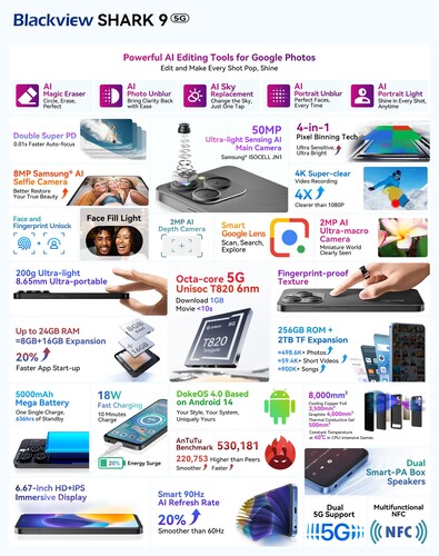 A Shark 9-ben egy 6 nanométeres Unisoc T820 található, ez 5G modemmel felszerelt SoC. A CPU egy Cortex-A76 magot használ 2,7 GHz-en, hármat 2,3 GHz-en, mellette pedig van négy klaszterben 2,1 GHz-en pörgő Cortex-A55 energiatakarékos feladatokra. A processzor számítási teljesítménye egy hajszállal a MediaTek Hello G99 fölött van, viszont a Unisoc T820-ban használt Mali-G57 MP4-es GPU gyengébb. Az SoC ugyan kezelne akár 32 GB LPDDR4x típusú memóriát is, de a telefonban csak 8 GB-ot találni majd, amit virtuális RAM bővít akár a termékoldalon olvasható 24 GB-ra. A tárhely elvileg UFS 2.2-es, 256 GB van belőle és 2 TB-ig lehet bővíteni microSD-vel.