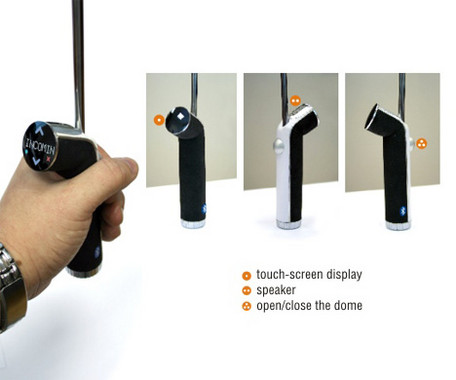 We have seen lots of interesting, exciting, useless and funny accessories, but Bluetooth Umbrella, designed by Mikhail Stawsky, doesn't really fit in any category. The idea is quite exciting, as the Bluetooth handsfree with a display, embedded in the handle of an umbrella, can really come in handy in rainy weather as we don't have to delve into our pockets, looking for the phone. At the same time, a Bluetooth headset has approximately the same amount of comfort features and it doesn't even look so strange on the charger like an umbrella, and when using the latter one half of the city won't hear the conversation. The concept pictured below will probably nevr become reality, but of course anything can happen nowadays.