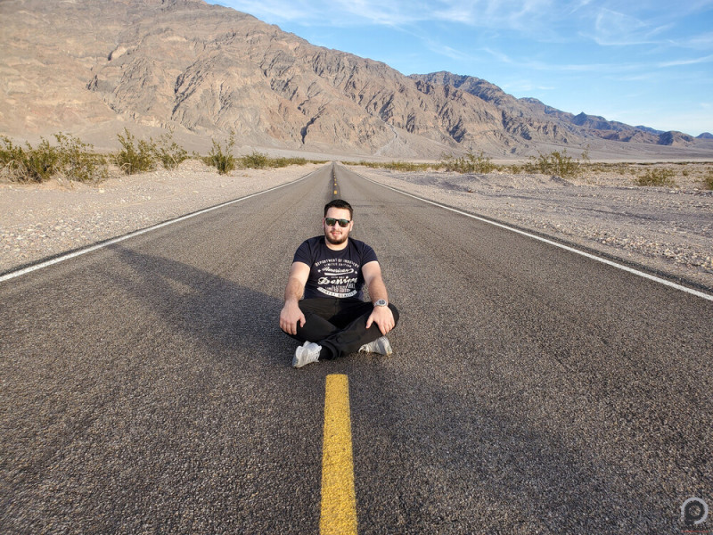 Majd ezt követően Ákosnak előhozakodott a nagy vágyával, hogy ő óhajt legalább egy képet, amin a semmi közepén végigfutó aszfaltcsíkon ül/áll/fekszik/ugrál/mereng, vagy bármi mást csinál, de egyenes legyen az út, ne legyen rajta forgalom és okvetlenül szerepeljen a fotón. Ilyen útszakaszt pedig pont tudtam, mert a Scotty's Castle felé vezető rész évek óta le van zárva, szóval arra nem sokan autózgatnak el, de mi nyilván igen, úgyhogy csináltunk egy nagy rakás fotót.