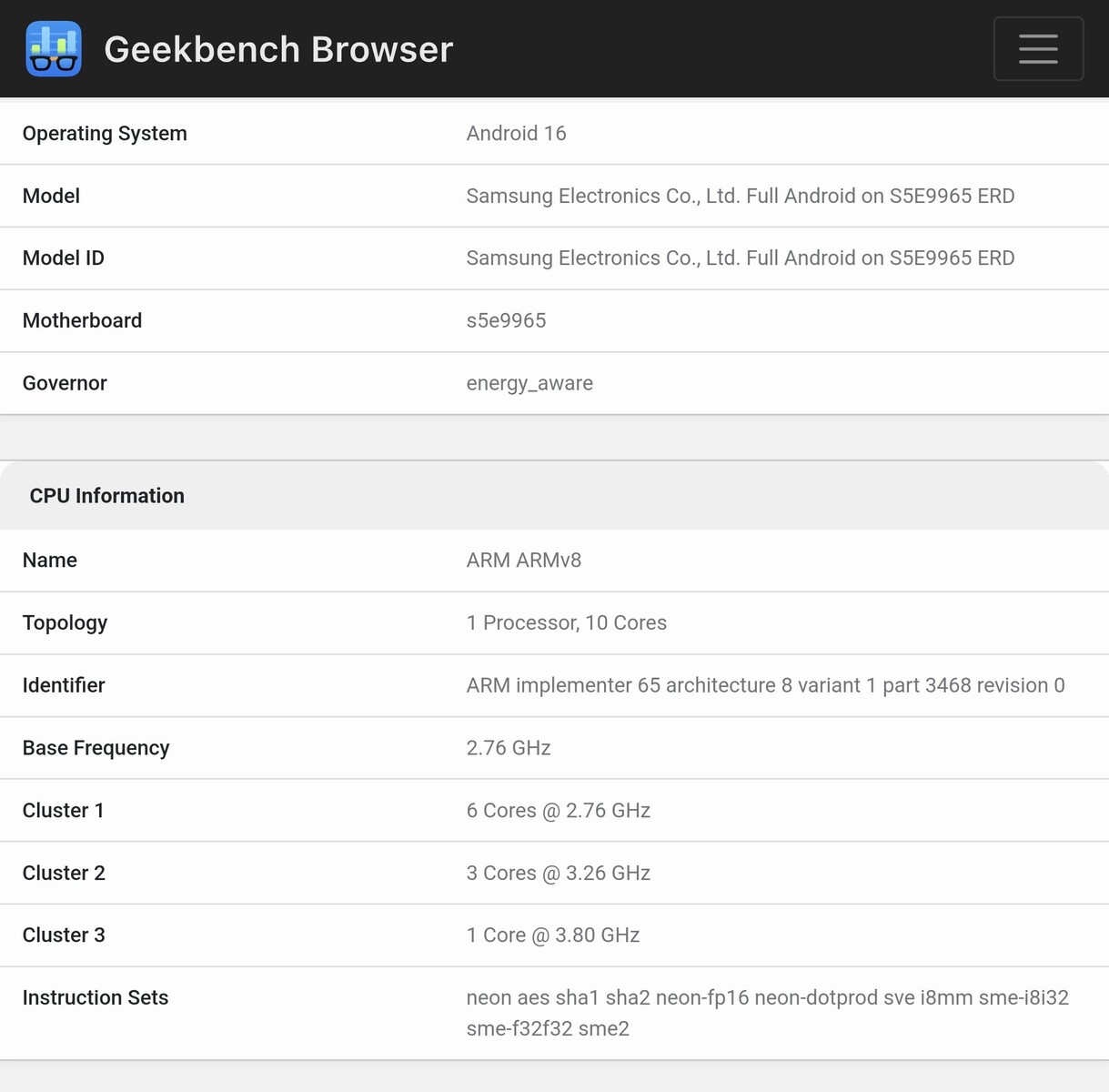 Feltételezhetően ezek egy Exynos 2600 prototípus eredményei és specifikációi a Geekbench adatbázisában (forrás: Notebook Check) [+]