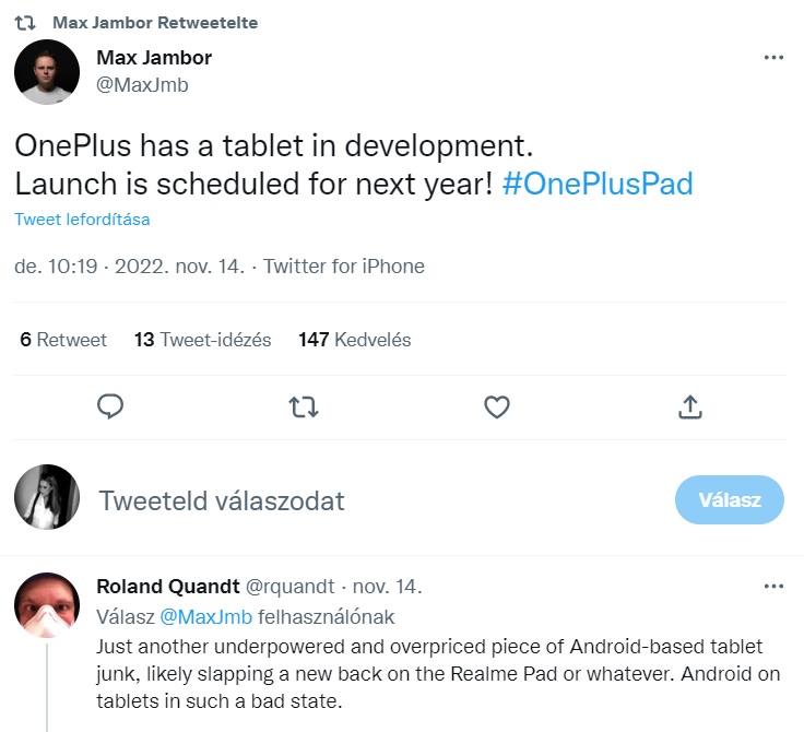 Max Jambor a Twitteren csak annyit közölt, hogy a készülőben van a OnePlus táblagépe, amely OnePlus Pad néven mutatkozik be jövőre. Ez annak ismeretében egyáltalán nem meglepő vagy váratlan, hogy a gyártó nyáron már le is védette a OnePlus Pad megnevezést az Európai Unió Szellemi Tulajdoni Hivatalánál, illetve a cégcsoportba tartozó brandek idén már tablettel is bővítették a portfóliót, ráadásul a nevezéktan is korrelál.