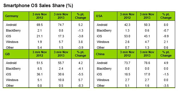 A Kantar legfrissebb beszámolója szerint az Apple az iPhone 5s és 5c kiadásával sem tudta megállítani a kulcsfontosságú régiókban a piaci részesedésének csökkenését. A szeptembertől november végéig tartó háromhavi periódus alatt az Egyesült Államokban 9,9 százalékos visszaesést volt kénytelen elkönyvelni, mely mellett az Egyesült Királyságban, Németországban és Kínában is rendre 5,5, 3,8 és 1,5 százalékos csökkenést szenvedett el. A mélyen árazott Windows Phone mobilok növekvő népszerűsége és a műszaki paraméterek terén messze túlmutató Android és Windows Phone konkurensekkel az Apple szinte minden régióban egyre nehezebben veszi fel a versenyt, mely révén a Microsoft már tucatnyi régióban a második helyre tudta felküzdeni magát. A kaliforniai vállalat legsikeresebb piaca egyértelműen Japán, ahol az összes értékesített okostelefon 69 százaléka iPhone.