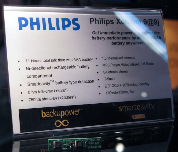Philips announced at Mobile World Congress its special model, the Xenium 9@9j, which can use AAA batteries as a power source. The handset has a 750 mAh built-in Li-ion battery, which provides 8 hours of talk time, but this can be increased, up to 11 hours, with the help of an AAA battery. The device has Smartcavity battery-recognition technology, so it can detect AAA rechargeable batteries and charges only those, not the standard alkaline ones. The phone with a 176 x 220 display, 1.3 megapixel camera, FM radio, stereo Bluetooth support and a size of 110 x 45 x 11 mm, is expected to be available in April. No price has been announced yet.