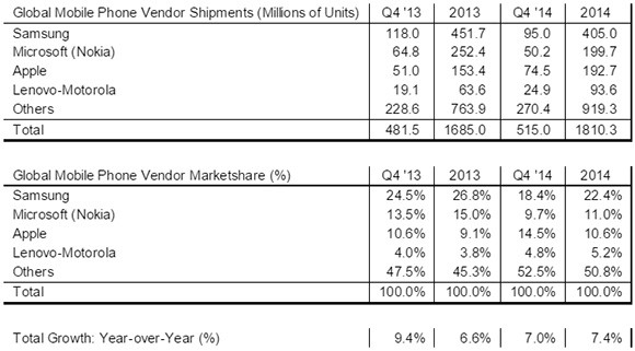 A Strategy Analytics egyébként a Q4 mellett 2014 egészét tekintve is közölte felmérési adatait, és itt a Samsung előnye eléggé tetemes: mobiltelefonokból 405 milliót szállítottak le, amiből 317,2 millió darab volt valamilyen okostelefon.