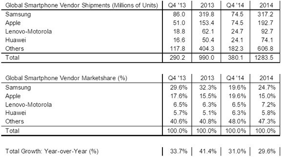 A Strategy Analytics friss felmérése szerint a 2014-es esztendő negyedik negyedévében a Samsung 74,5 millió okostelefont szállított le, ami a forrás szerint pont annyi, amennyit a koreaiak legfőbb riválisa, az Apple tudott felmutatni. A számok a cupertinóiaknak kedveznek, hiszen egy évvel korábban mindössze 51 millió okostelefont szállítottak le, mutatva a megnövekedett képernyős iPhone 6 és iPhone 6 Plus globális sikerét. A Samsung ezzel szemben 86 millió okosmobilt szállított le 2013 negyedik negyedévében, a visszaesés okai között pedig az új iPhone-ok mellett a feltörekvő ázsiai márkák sikerét kell megemlíteni, főleg a Xiaomiét.