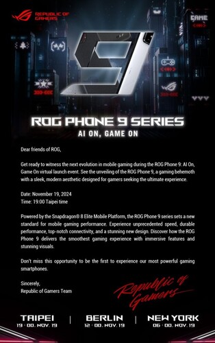 Az Asus a ROG Phone 9-et magyar idő szerint november 19-én délben fogja prezentálni, viszont a telefonról már most láthatunk két fotót a gyártó jóvoltából. Az eszköz külső megjelenésében szinte változatlan a ROG Phone 8-hoz képest, a fotó alapján a hátoldali mini LED-es kijelző és a Republic of Gamers felirat kap egy kis változást. A keret jobb oldalán maradnak az érintésérzékeny AirTriggers ravaszok, a három hátlapi kamera, illetve a kijelzőbe lyukasztott előlapi kamera.