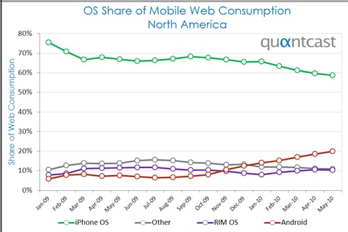 A májusi adatforgalmi kimutatások szerint az Egyesült Államokban az összes mobilos adatforgalom 58,8 százalékát iOS (korábbi nevén iPhone OS) alapú készülékek segítségével bonyolították le, mely, habár kiemelkedően magas, a trend alapján folyamatosan csökkenni látszik. Az Apple készülékei mellé csomagolt adatforgalmi opciók és a kényelmes Safari böngésző komoly áttörést jelentett a mobil adatcsomagok térnyerésében, ám a Google által fejlesztett Android platform hasonlóan kényelmes megoldásai is egyre nagyobb teret kapnak. 2009 októbere óta az Android platform köré épített készülékek mobilok adatforgalma folyamatosan növekedni látszik, mely jelenleg a teljes adatforgalom 20 százalékát teszi ki. Az Egyesült Államokban jelenleg körülbelül azonos mennyiségű iOS és Android OS alapú mobil van forgalomban, ám az utóbbi mellé nem minden esetben kötelező korlátlan adatforgalmi csomagot rendelni, bár a Google online szolgáltatások miatt erre majdnem minden esetben szükség van. A két platform közötti verseny az iPhone 4, HTC EVO 4G és más Android alapú Motorola és HTC modellek piaci bevezetésével egyre kiélezettebbé válik majd, ám várhatóan a nyár végétől a RIM új BlackBerry modelljei is ringbe szállnak majd az új WebKIT alapú böngészővel.