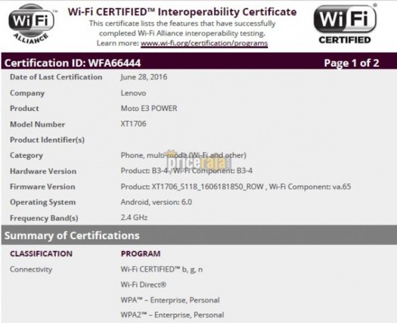 A hónap elején kapta meg a WiFi csoport jóváhagyását a Moto E3, most pedig egy újabb készülék teljesítette sikerrel a teszteket. Az alant látható táblázat egy újabb variánsról árulkodik, ami elvileg Moto E3 Power néven kerülhet forgalomba, modellszáma pedig XT1706. Egy ilyen jelöléssel ellátott mobil korábban már benchmark adatbázisban is felbukkant, így lehet tudni, hogy 5 hüvelykes, HD felbontású kijelzőre számíthatunk.