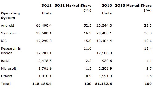 A Gartner legfrissebb elemzése szerint a harmadik negyedév során az Android platform piaci részesedése már 52,5 százalék felett jár, vagyis az előző év azonos időszakában elért 25,3 százalékos szinthez képest több mint kétszeresére nőtt. A nagyobb operációs rendszerek közül egyedül a bada OS tudott hasonló bővülést felmutatni, vagyis a részesedése 1,1-ről 2,2-re nőtt. Az elmúlt év legnagyobb vesztese minden kétséget kizáróan a Symbian lett, mely abszolút darabszámban és részesedését tekintve is a legnagyobb visszaesést produkálta, igaz, a 16,9 százalékos részesedésével még így is a második legkeresettebb ajánlata. Jelentős visszaesés tapasztalható a Windows Phone és BlackBerry platformok esetén is, míg az Apple részesedése csupán az okostelefonok piacának jelentős bővülése miatt csökkent.